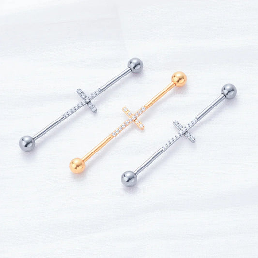 Titanium industrial barbell 16G 14G with a cross 38mm with CZ industrial bar piercing gold silver