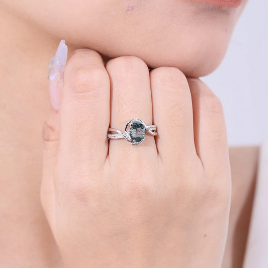 Vintage moss agate ring large stone green moss agate engagement ring silver for women