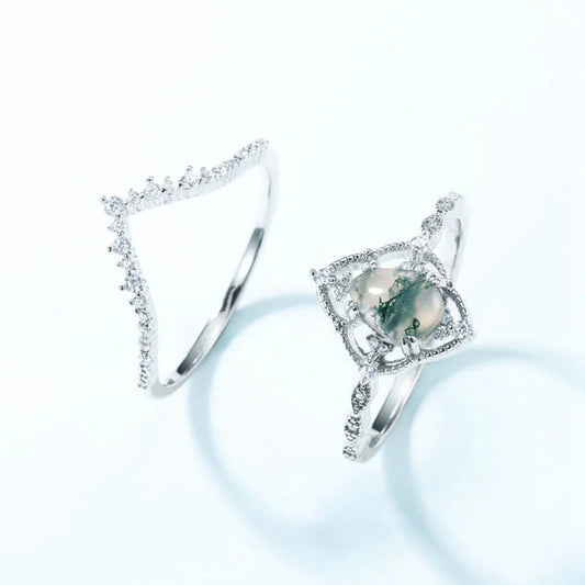 Kite cut moss agate ring engagement ring set made of 9K 14K 18K gold and sterling silver with a curved wedding ring
