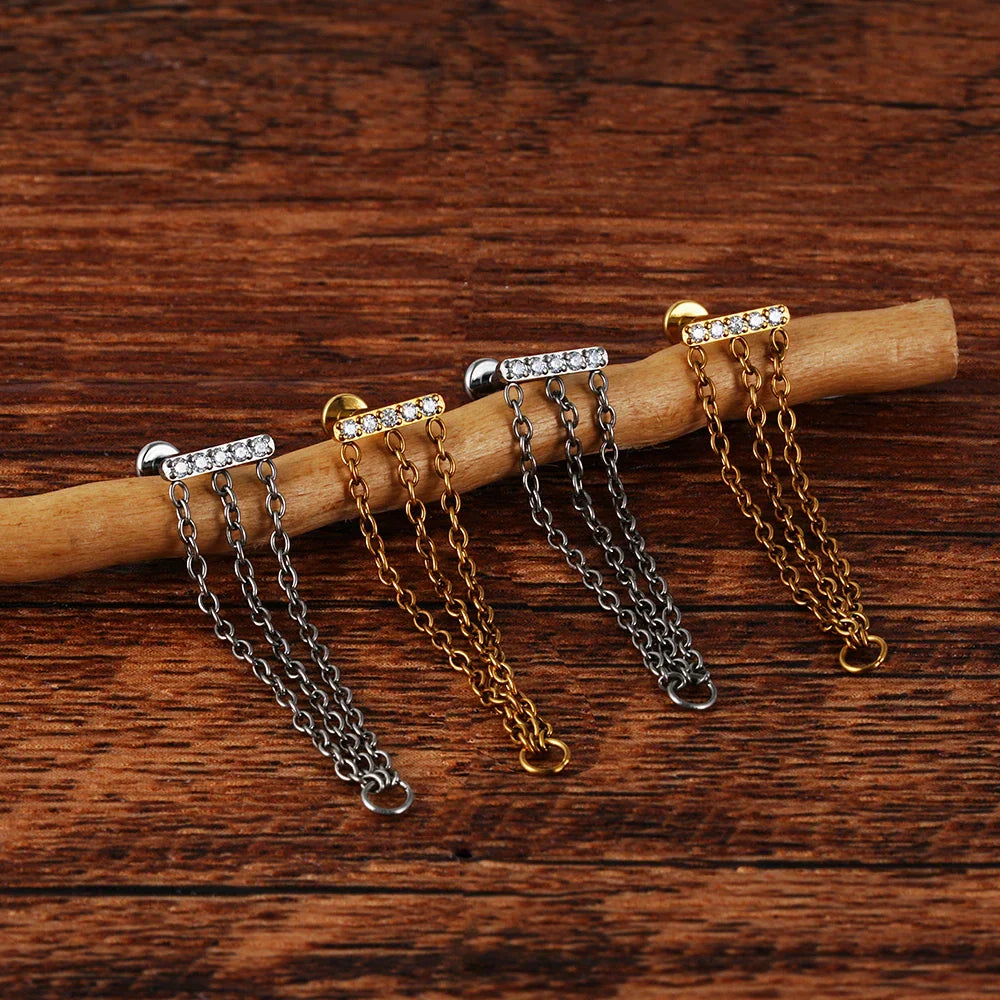 Conch chain earring with three chains and diamonds titanium 16G flat back conch stud with chain