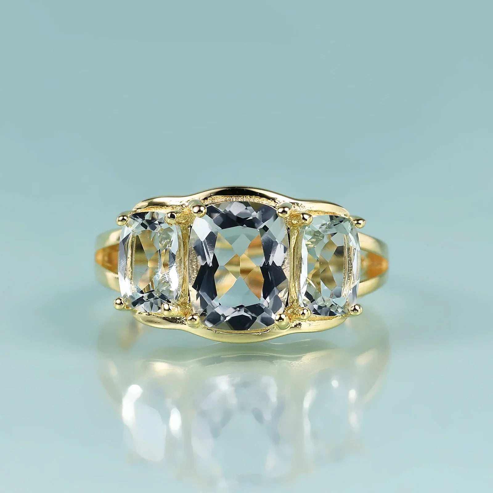 Green amethyst ring three stone engagement ring sterling silver 14k gold adjustable ring
