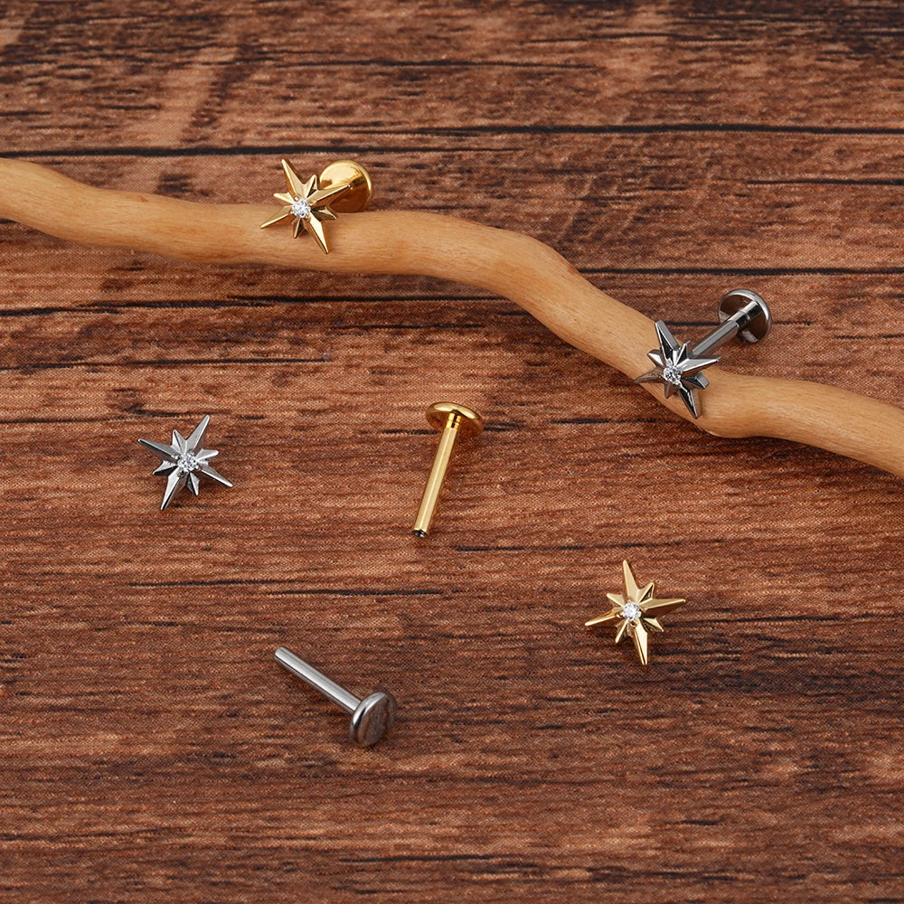 Inner conch stud with a star and a diamond flat back 16 gauge gold silver titanium