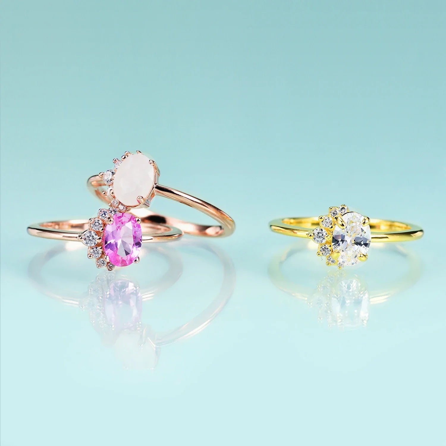 Rose gold moonstone ring with clear cz arranged in a half circle wedding ring for women