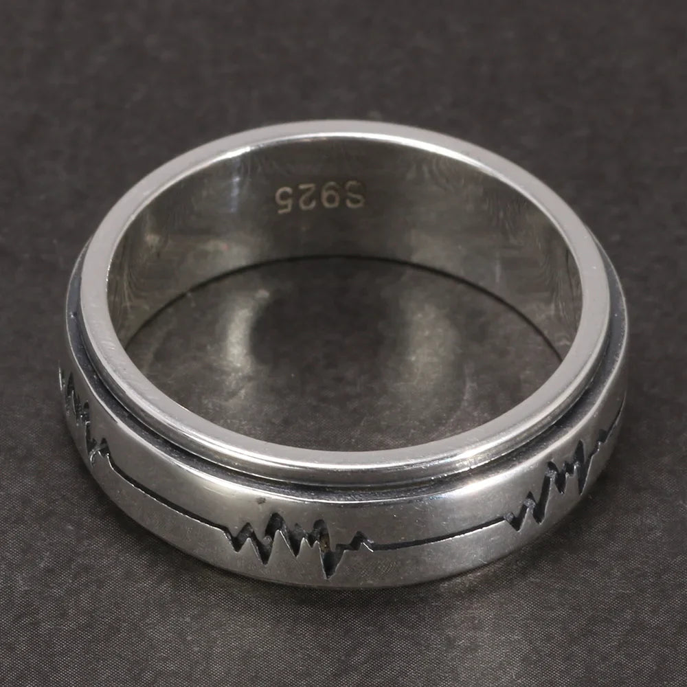 Spinning fidget ring heart beat pulse line sterling silver band