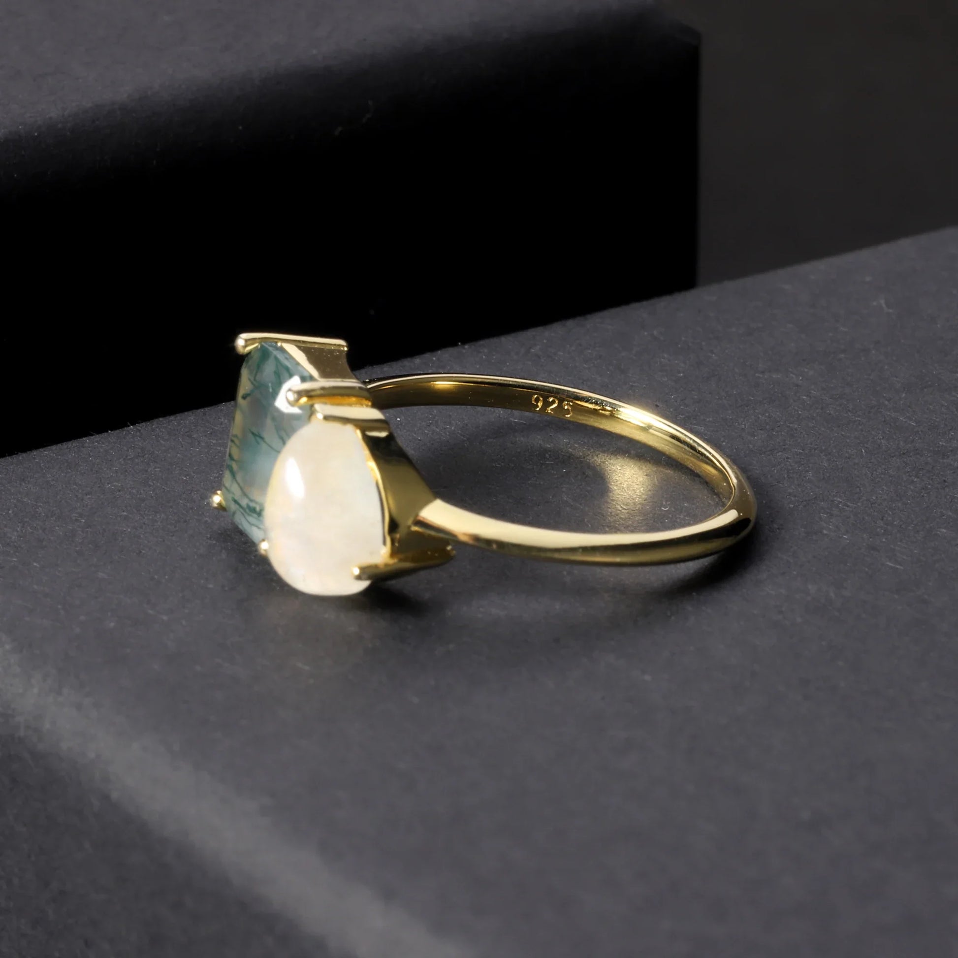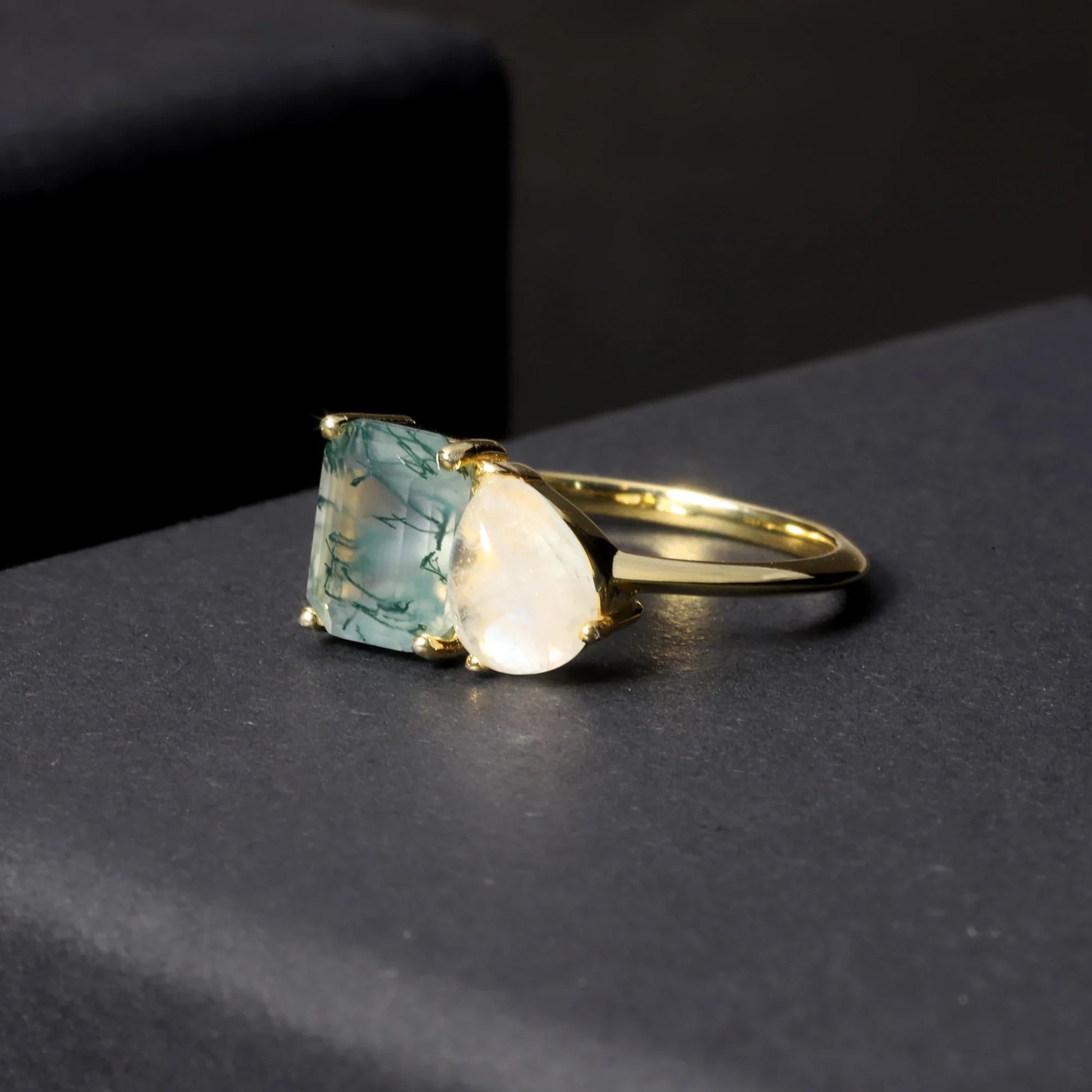 You and me ring with a natural green moss agate and a moonstone toi et moi ring